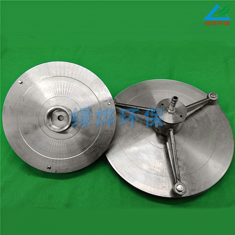 TV型溶气释放器在正常工作时,振动盘因弹簧压力而与固定盘保持最佳工作状态时的间隙。如当水中杂质堵塞释放器而无法正常释放时,则可接通压缩空气机气源,使振动盘落下一段距离,致使水流通道加大,杂质很快被溶气水冲走,约隔数秒钟后,切断气源并打开放气阀放气,使振动盘复位,再次处于最佳工作状态。为了防止释放器在废水中的腐蚀,采用了不锈钢材质和铜材质。