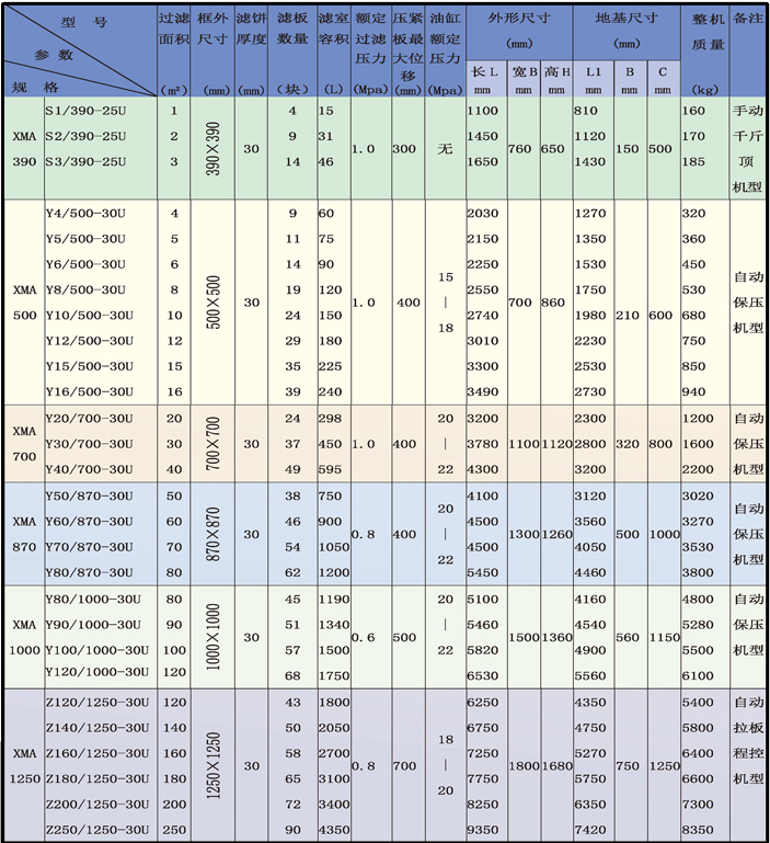 压滤机参数表:
